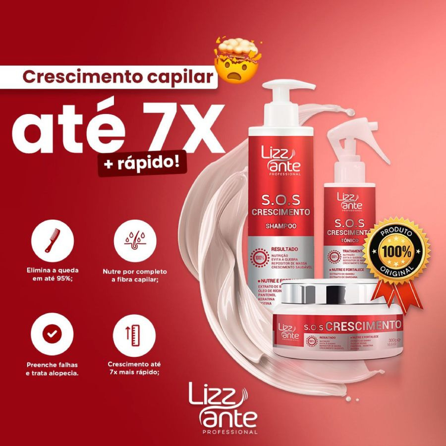 O Kit S.O.S Crescimento é o tratamento nº 1 no combate à queda capilar e no estímulo ao crescimento acelerado dos fios. Com fórmula exclusiva e alta concentração de 7 ativos, ele age diretamente no bulbo capilar, paralisando a queda, preenchendo falhas e fortalecendo os fios desde a primeira aplicação.
