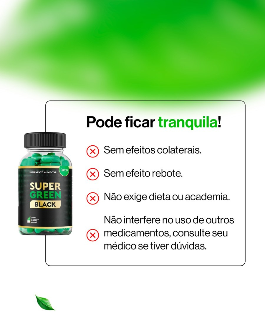 Ideal para quem busca emagrecer com equilíbrio, leveza e bem-estar. Com apenas 2 cápsulas por dia, Super Green Black transforma seu corpo e sua autoestima.